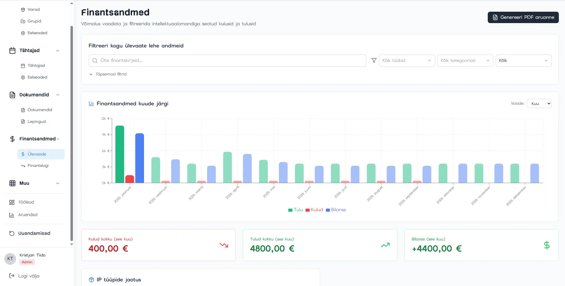 Arendasime kõikehõlmava veebiportaali, mis võimaldab Tartu Ülikoolil lihtsamini hallata oma 600+ intellektuaalomandi vara nagu patente, autoriõiguseid, kaubamärke jm. Platvorm kuvab kasutajatele 360-kraadise ülevaate varade kohta, nagu nende aegumine, määratud tähtajad, lepingud, finantsid ning automaatsed teavitused.