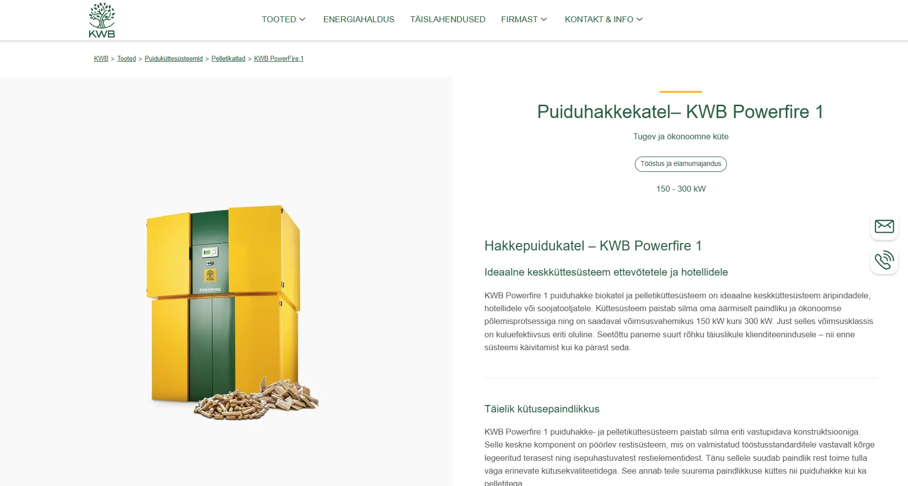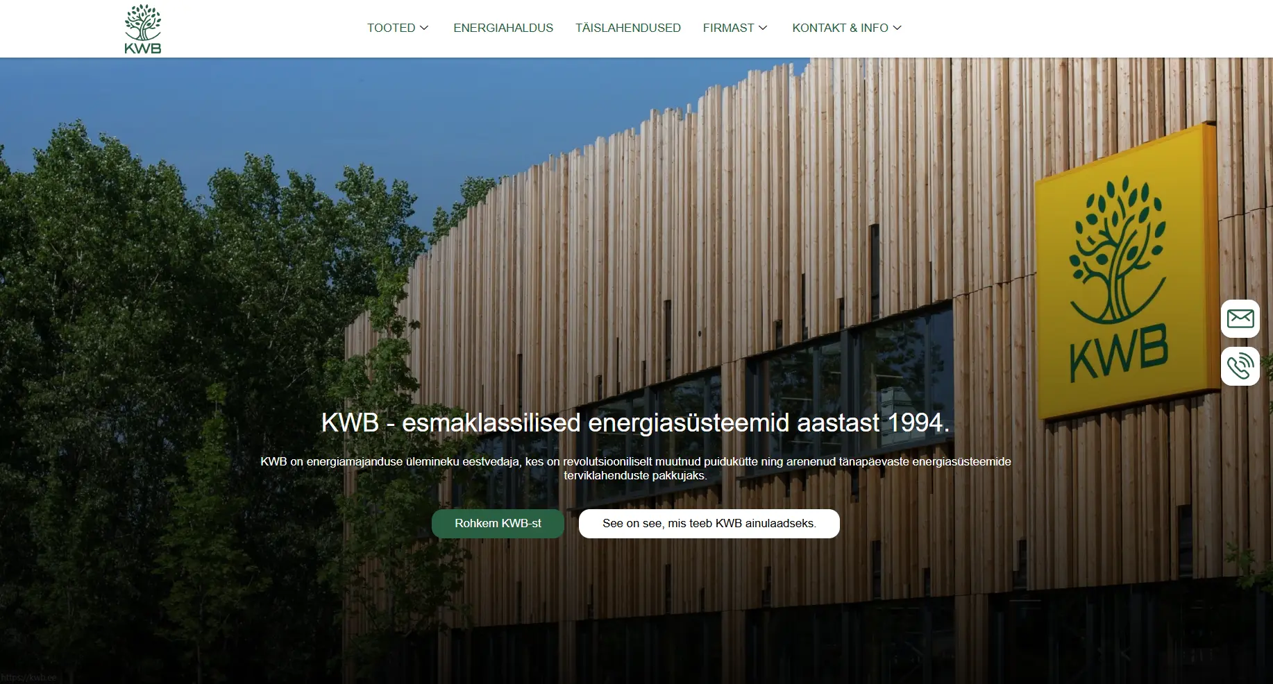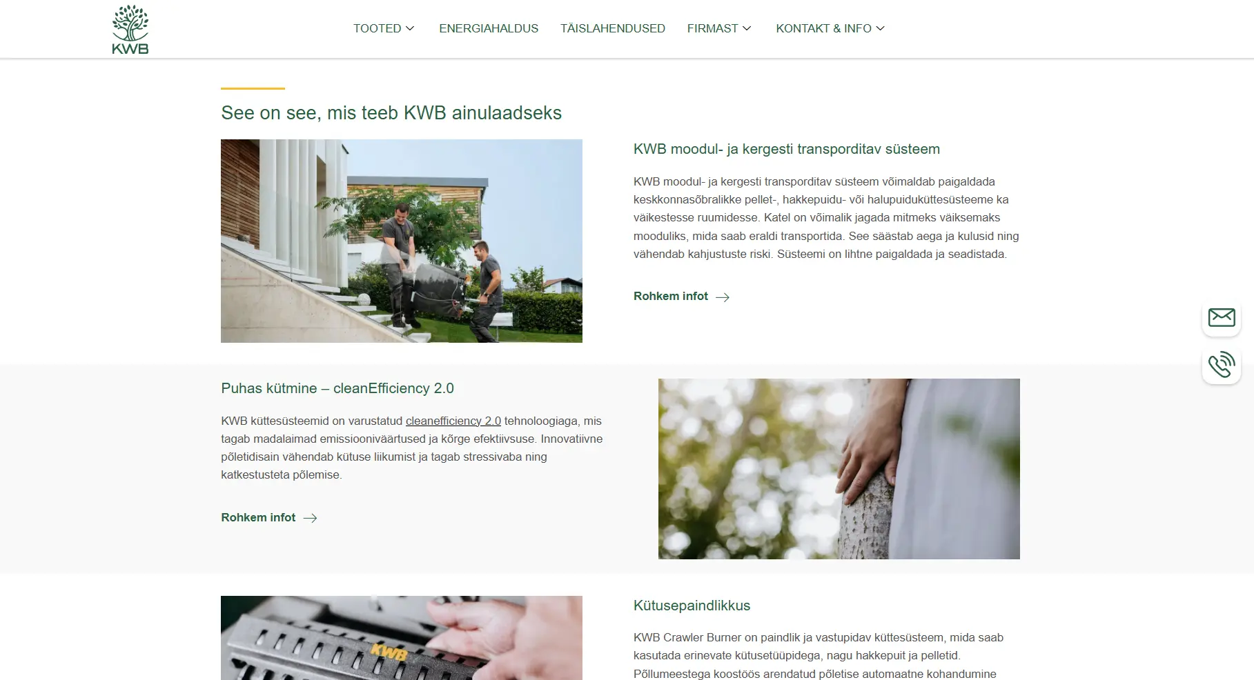 KWB Eesti koduleht kütteseadmete ja lahenduste tutvustamiseks, tootekataloogi ja brändiga.